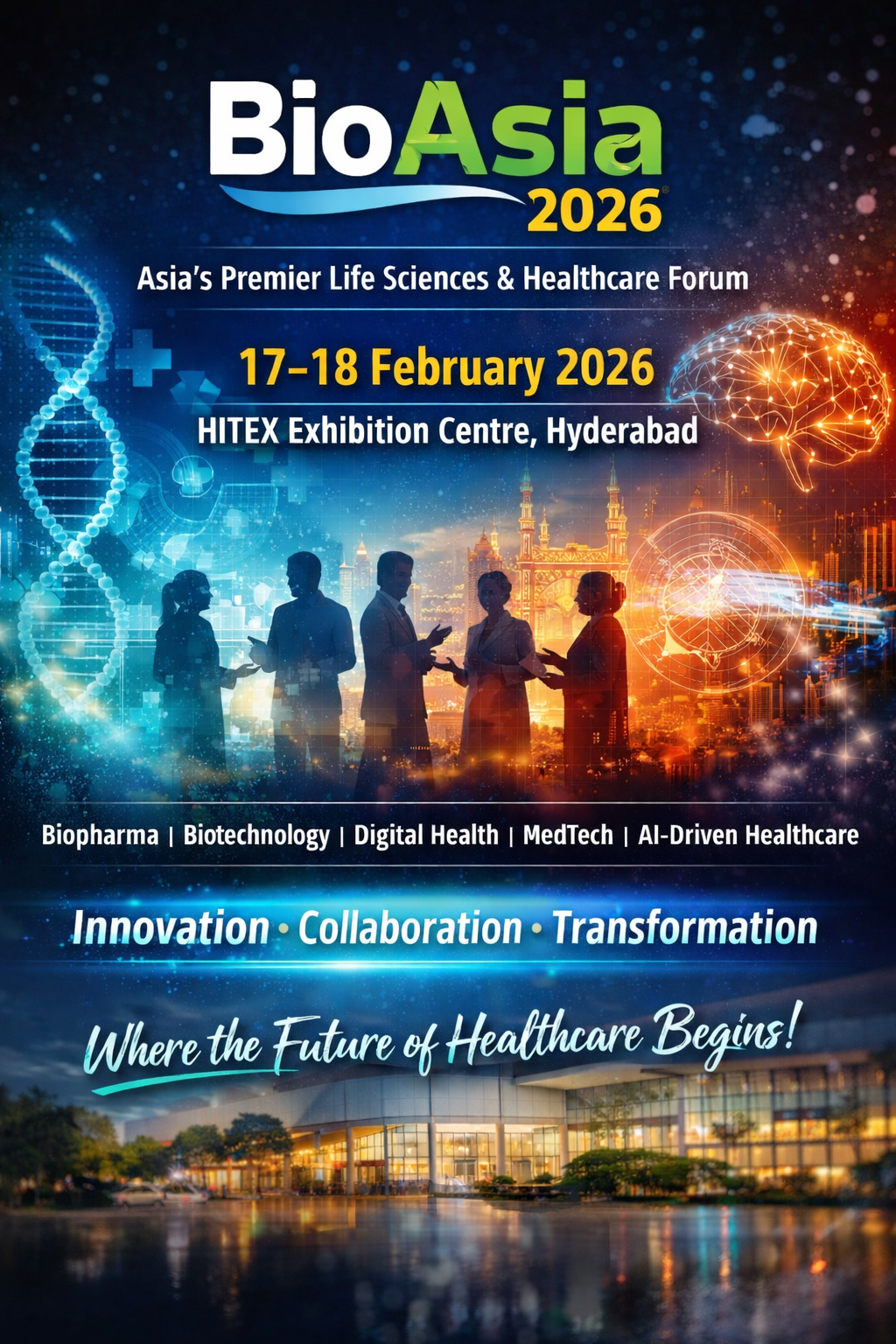 BioAsia 2026 brings together global leaders and innovators in Biopharma, Digital Health, MedTech, and AI-driven Healthcare, creating a powerful platform for collaboration, knowledge exchange, and breakthrough innovations.