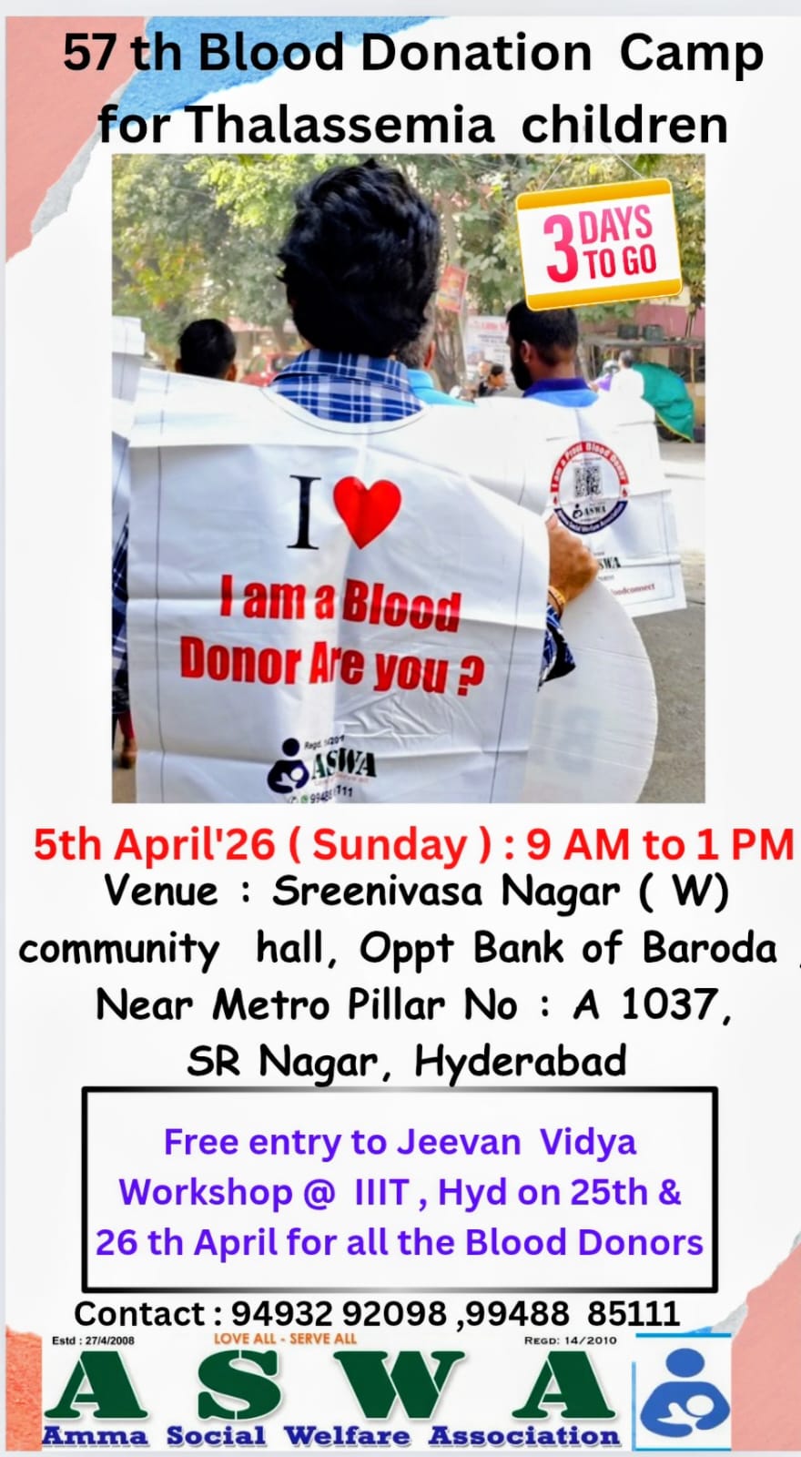 All blood donors will receive free entry to a Jeevan Vidya Workshop at IIIIT, Hyderabad on 25th & 26th April. It’s a wonderful opportunity to learn, grow, and be part of a mindful community after giving the gift of life.