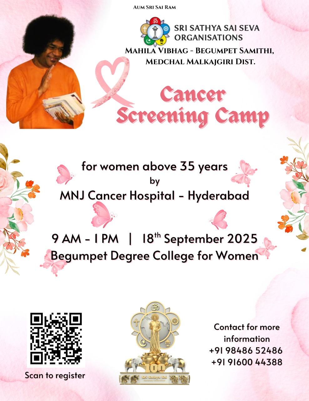 MNJ Cancer Screening Camp organized by Satya Sai Seva Organization at Begumpet Degree College on September 18, 2025.